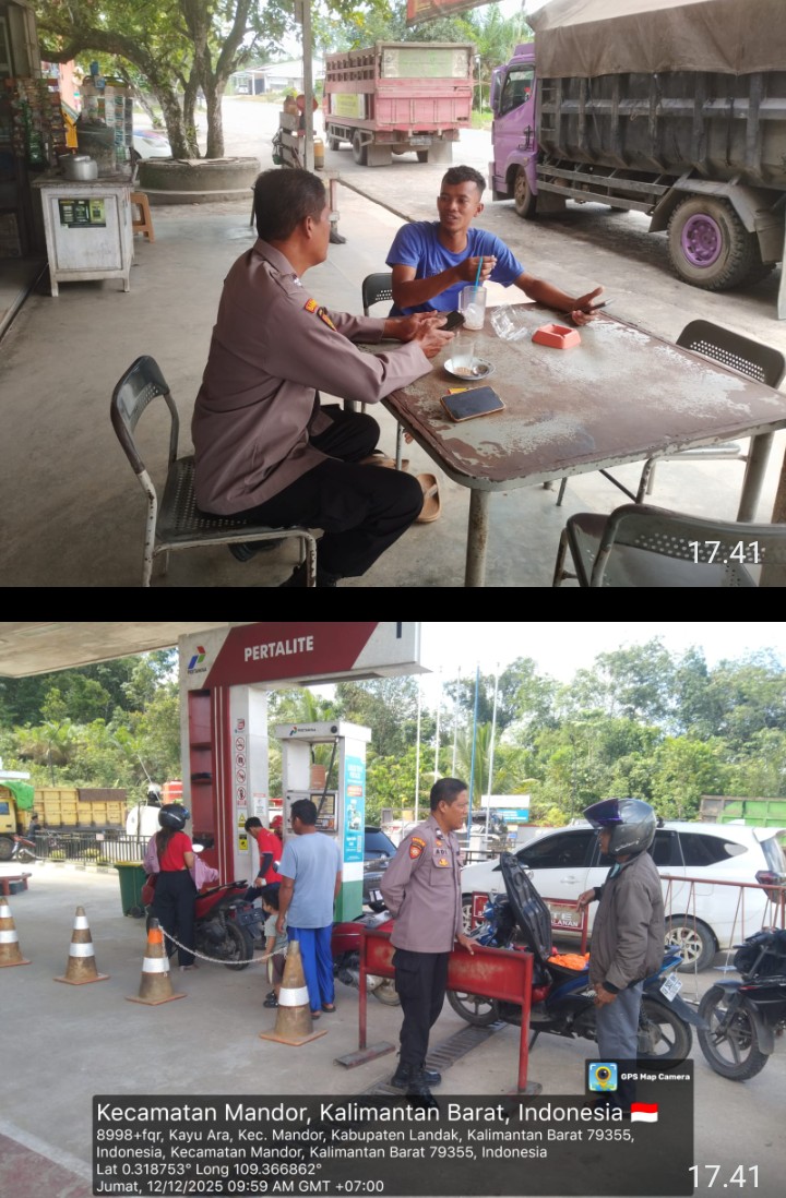 Polsek Mandor~ Polres Landak ~ Polda Kalbar (updatekalbar.top) ~ Jumat (12/12/2025), suasana siang di SPBU Kecamatan Mandor tampak lebih hidup dari biasanya. Petugas kepolisian dari Polsek Mandor terlihat melaksanakan patroli rutin sekaligus berinteraksi langsung dengan warga yang sedang mengantre pengisian bahan bakar. Kehadiran polisi tidak hanya memastikan situasi tetap aman dan tertib, tetapi juga memberikan rasa nyaman bagi masyarakat yang beraktivitas.
